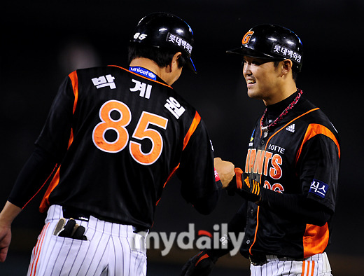 [역전 결승타를 터뜨린 박종윤(위)-9회 동점 투런포를 터뜨린 롯데 강민호. 사진 = 유진형 기자 zolong@mydaily.co.kr]