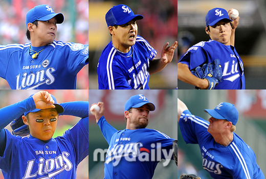 [시계방향으로 윤성환, 장원삼, 차우찬, 브라이언 고든, 미치 탈보트, 배영수. 사진 = 마이데일리 사진 DB]