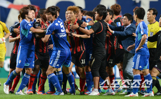 | 20일 서울-수원의 FA컵 16강전에서 후반 양팀의 선수와 코칭스태프가 그라운드 위에서 몸 싸움을 벌이며 일촉즉발의 분위기를 연출하고 있다. 상암=허상욱 기자 wook@sportschosun.com |