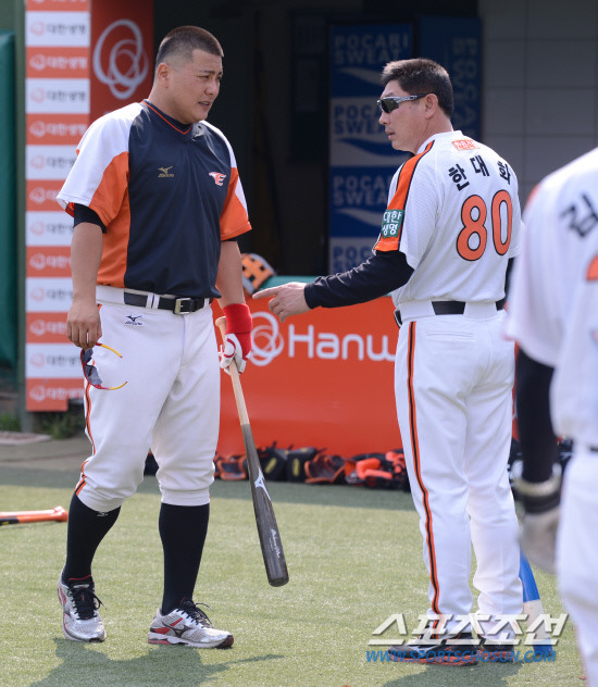 | 19일 오후 대전 한밭야구장에서 2012 프로야구 LG와 한화의 경기가 열렸다. 시합 전 한화 한대화 감독이 김태균의 상태를 살피고 있다. 대전=김경민 기자 kyungmin@sportschosun.com / 2012.06.19. |