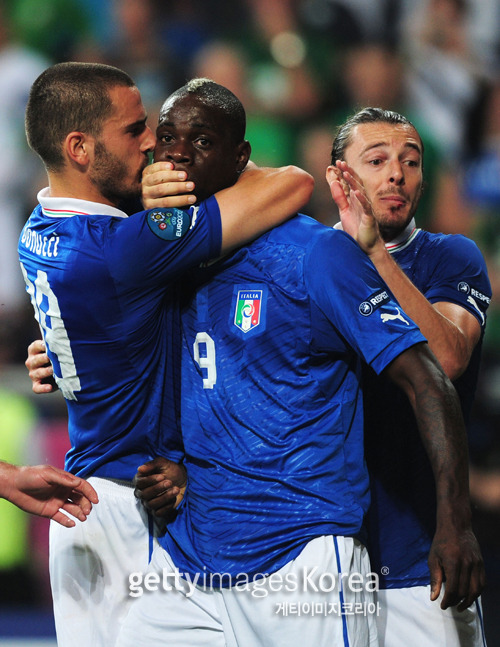 ▲ 아일랜드전에서 골을 터뜨린 마리오 발로텔리가 뭔가 말을 하려고 하자 팀동료 레오나르도 보누치가 발로텔리의 입을 막고 있다. 사진=Gettyimages/멀티비츠