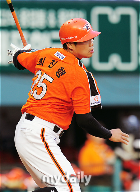 이후 김태균이 좌익수 앞으로가는 타구를 만들었다. 하지만, 좌익수 김현수가 잡을 수 있는 타구를 놓쳤기에 3루주자 양성우의 스타트가 느렸다. 결국 양성우는 홈에서 아웃됐다. 그러나 1사 만루 상황은 이어졌고, 결국 8회 아쉬움을 삼켰던 최진행이 볼카운트 2B1S에서 5구째에 우전 안타를 쳐내며 경기를 극적으로 마무리 지었다.