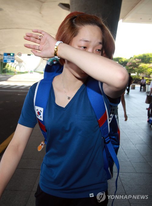 (영종도=연합뉴스) 임헌정 기자 = 런던올림픽 배드민턴 여자복식 조별리그에서 '고의 패배'로 실격된 정경은-김하나, 하정은-김민정 등 4명의 선수가 귀국했다. 하정은(대교눈높이)이 4일 오후 영종도 인천국제공항을 통해 입국한 뒤 취재진을 보자 얼굴을 가리고 있다. 2012.8.4