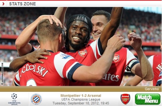 아스널은 19일(이하 한국시간) 프랑스 스타드 드 라 모송 스타디움에서 열린 '2012/2013 UEFA 챔피언스리그' 조별예선 B조 1차전에서 루카스 포돌스키와 제르비뉴의 릴레이골을 앞세워 몽펠리에를 2-1로 꺾고 첫 승을 신고했다.