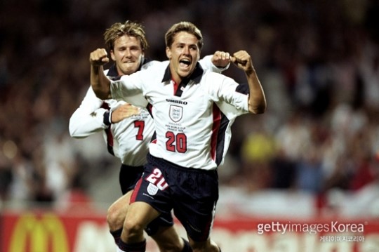 ![]() 1998년 프랑스 월드컵에서 골을 넣고 베컴과 함께 좋아하는 오언 (사진제공 : 게티이미지) |