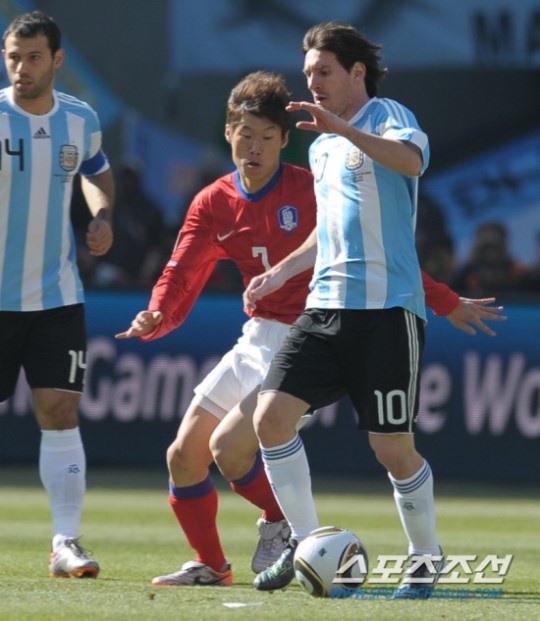 | 2010년 남아공월드컵에서 메시가 박지성을 상대로 드리블하고 있다. 김경민 기자 kyungmin@sportschosun.com |