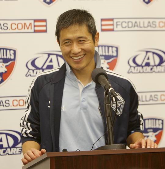 ![]() FC댈러스 경기 후 인터뷰 룸에 나타난 이영표. 텍사스에서 발행되는 한인 상대 지역 신문 기자들을 상대로 다양한 질의응답 시간을 가졌다.(사진=순스포츠 홍순국 기자) |