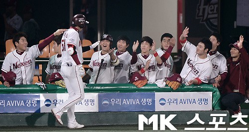 | 20일 오후 목동구장에서 열린 2012 팔도 프로야구 롯데와 넥센의 경기, 2회말 2사에서 넥센 장기영이 롯데 선발 유먼을 상대로 우월 선제 솔로홈런을 치고 동료들과 하이파이브를 나누고 있다. 내년 시즌 가장 먼저 선수들과 하이파이브를 할 차기 감독에 대해 야구계의 관심이 쏠리고 있다. 사진(목동) = 김현민 기자 \n |