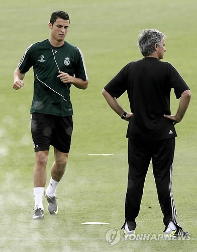![]() 챔피언스리그 첫 경기를 하루 앞둔 17일, 레알 마드리드의 호날두가 무리뉴 감독 곁에서 몸을 풀고 있다. (사진=연합뉴스) |