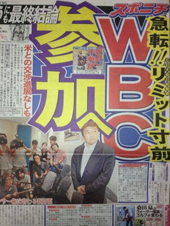 ![]() 일본 선수회의 WBC 참가 결정 소식을 1면에 게재한 일본스포츠신문 |